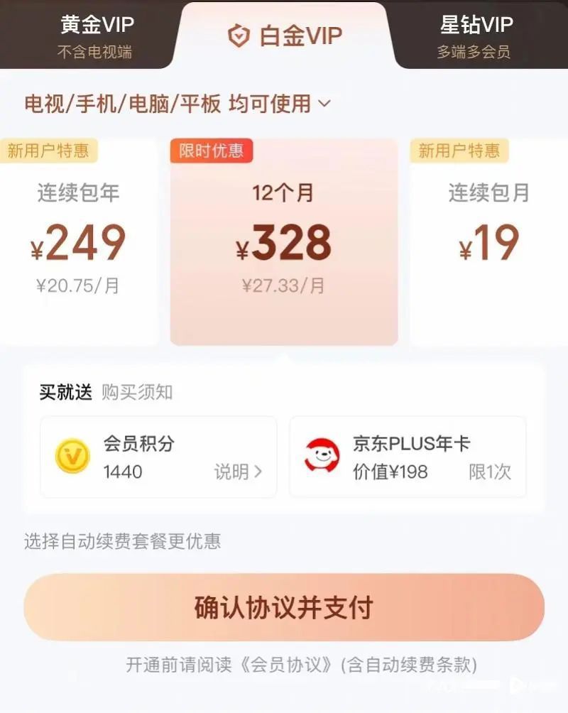 以目前位于第一梯队的视频平台“爱优腾”为例,电视端观看爱奇艺内容(爱奇艺的电视端软件“奇异果”)的只有白金会员、星钻会员和第三方合作的奇异果会员。爱奇艺原价258元/年的黄金会员,目前不支持TV端。可支持在电视、VR、电脑、手机和iPad上通用的爱奇艺白金会员和星钻会员,会员费分别是每年328元和448元。