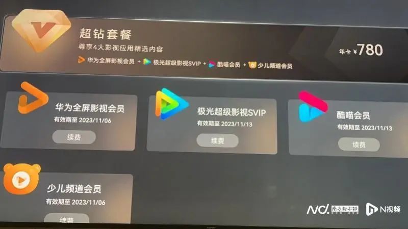 尽管有组合套餐,但包含华为全屏影视会员、酷喵会员、极光超级影视VIP、华为视频少儿会员四个会员的超钻套餐,年包费就高达780元,此外需要再看别的平台(如爱奇艺、B站内容等),还需要再购买其平台会员。以华为智慧屏自带的第三方平台APP为例,如果全选了这11个影视娱乐APP年费会员叠加上超钻套餐,则费用高达3778元。