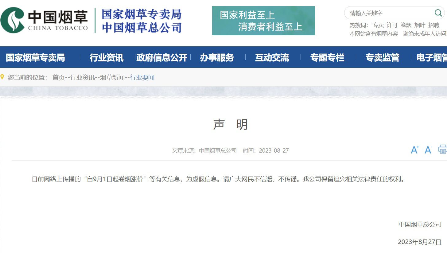 中国烟草总公司8月27日晚间发布声明称,日前网络上传播的“自9月1日起卷烟涨价”等有关信息,为虚假信息。请广大网民不信谣、不传谣。我公司保留追究相关法律责任的权利。