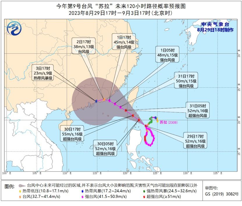 大风预报:8月29日20时至30日20时,巴士海峡、台湾海峡、台湾以东洋面偏南海域、南海东北部的部分海域、福建沿海、台湾岛东南部沿海将有6-8级、阵风9-10级的大风,其中巴士海峡海域风力可达9-10级,部分海域风力可达11-13级,“苏拉”中心经过的附近海面的风力有14-16级、阵风17级及以上,请过往船只注意航行安全。