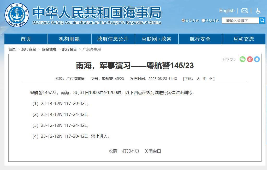 据中国海事局网站消息,广东海事局发布航行警告,8月31日10时至12时,南海部分海域进行实弹射击训练,禁止驶入。