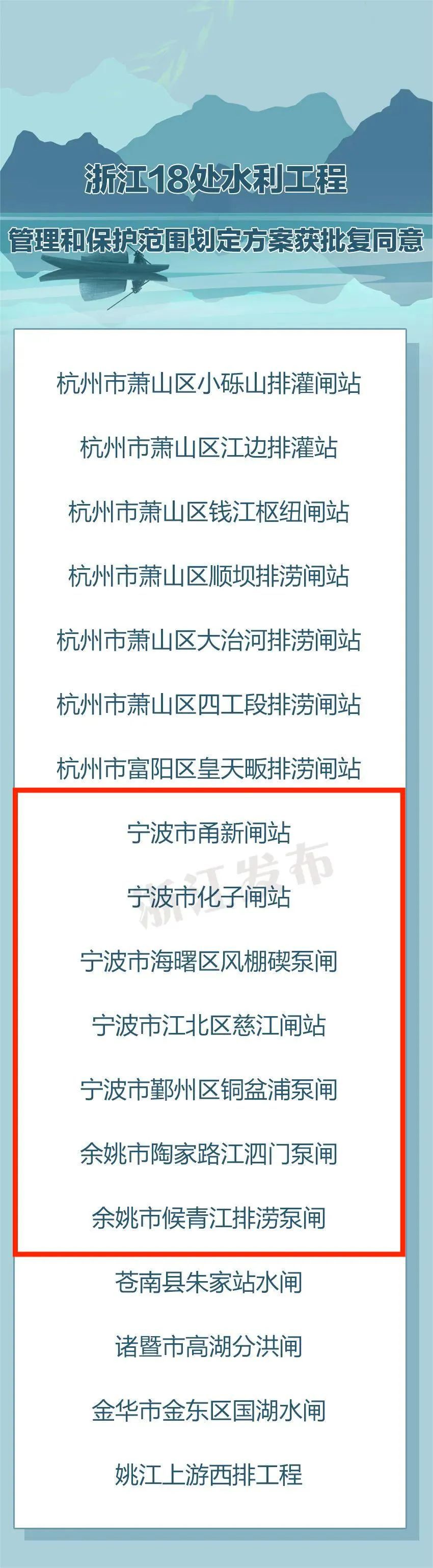 近日,浙江省政府发布《关于杭州市萧山区小砾山排灌闸站等18处水利工程管理和保护范围划定方案的批复》,原则同意宁波甬新闸站等18处水利工程的管理和保护范围划定方案。一起来看↓