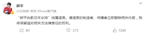 “郎平执教日本女排”纯属谣言。请谣言的制造者、传播者立即删除相关内容,我将保留追究相关方法律责任的权利。