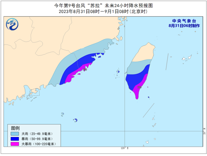 大风预报:8月31日08时至9月1日08时,巴士海峡、台湾海峡、南海东北部、福建沿海、广东中东部沿海、台湾岛南部沿海、东沙群岛将有6-8级、阵风9-10级的大风,其中巴士海峡偏西海域、南海东北部海域、东沙群岛的风力有9-11级,部分海域风力可达12-13级,“苏拉”中心经过的附近海面风力有14-17级、阵风17级以上。
