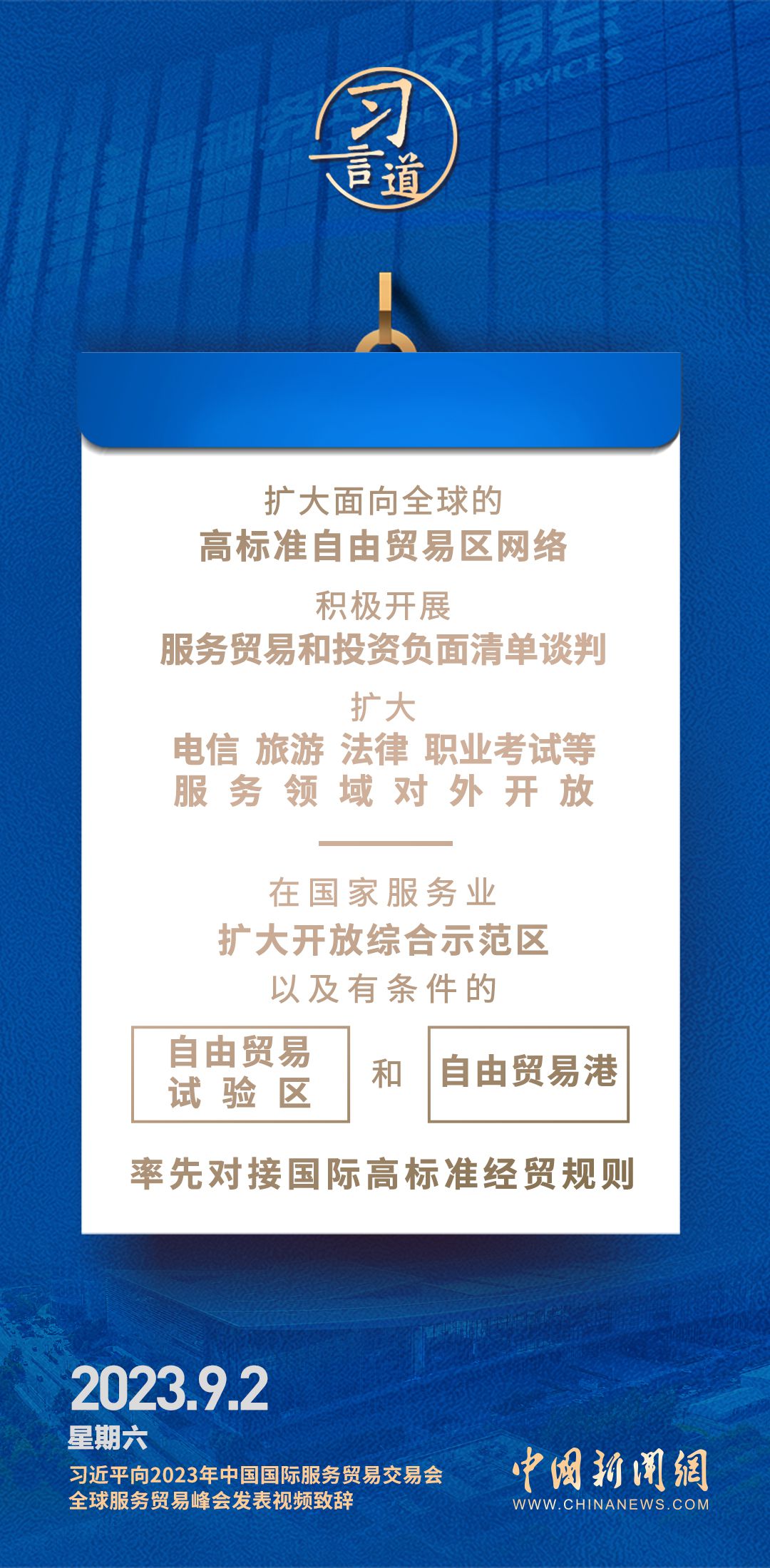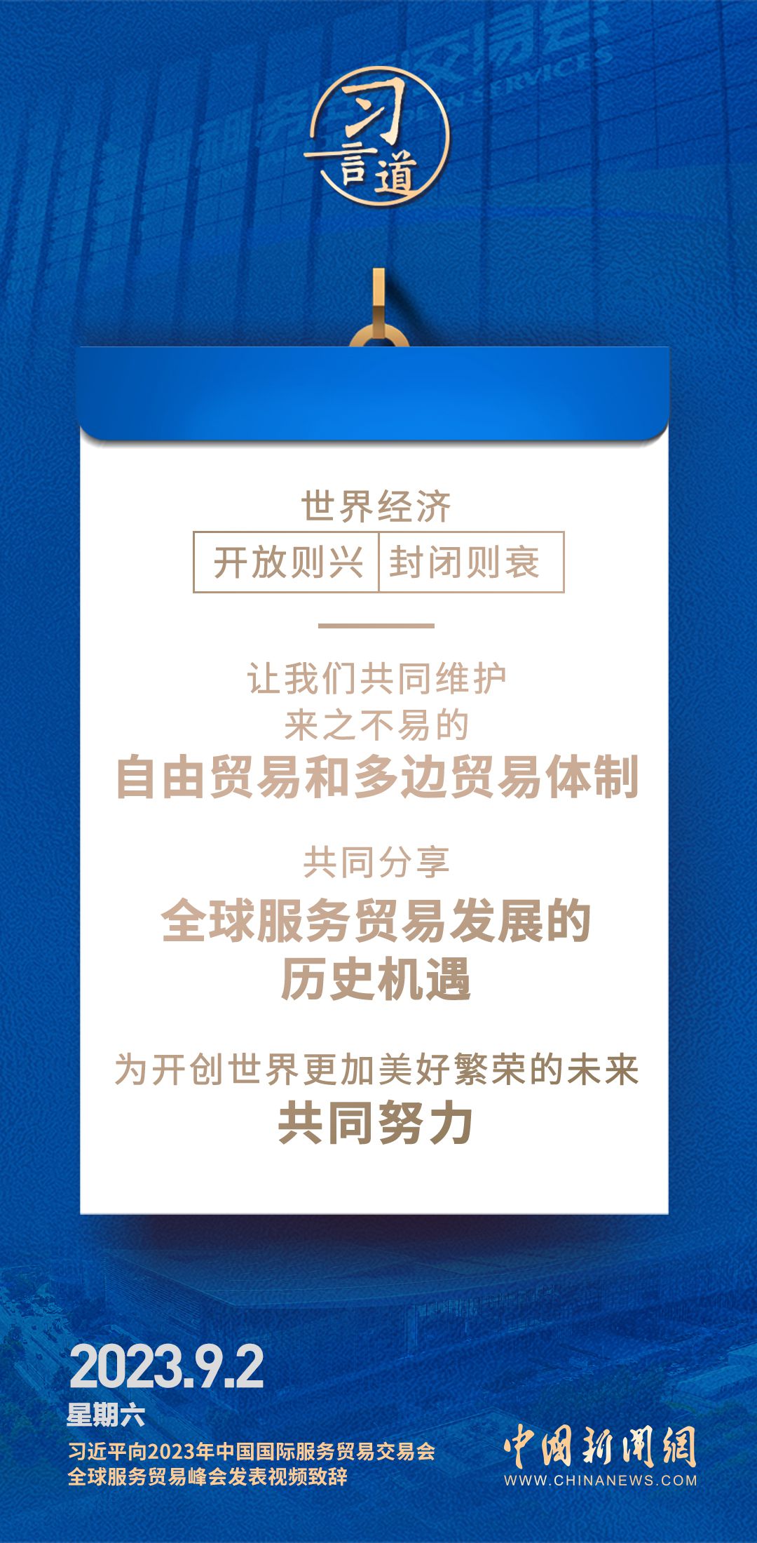 9月2日上午,国家主席习近平在北京向2023年中国国际服务贸易交易会全球服务贸易峰会发表视频致辞。习近平指出——