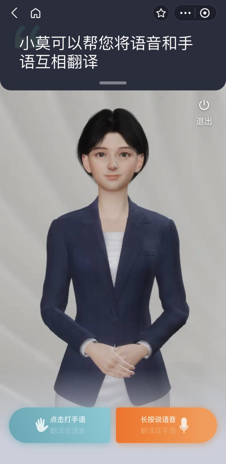 打开“手语翻译”,智能AI手语翻译官“小莫”出现在眼前,“小莫”具备手语识别和手语播报的双重能力,既可以将自然语言翻译成手语,也可以识别听障人士的手语并翻译成自然语言。