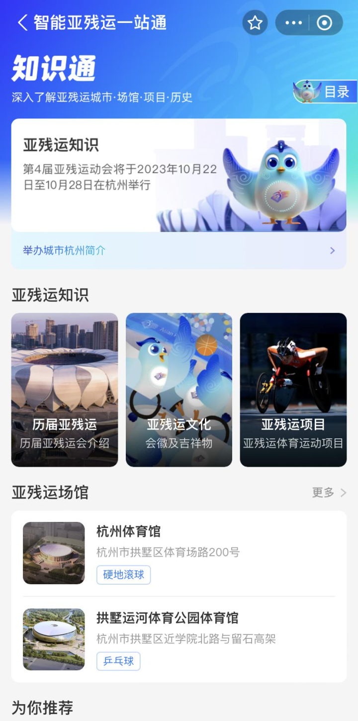 如果还想了解更多的亚残运会相关信息,可通过“知识通”了解。“知识通”将历届亚残运会介绍、亚残运会文化、亚残运会项目等亚残运会相关的信息进行多维度的呈现,让更多人通过“智能亚残运一站通”了解亚残运会,让残疾人体育运动被更多人看到。