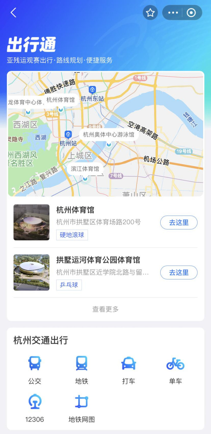 如何保障残障人士便捷出行、顺利到达目的地?通过“出行通”可以实现以亚残运会场馆为目的地的行程规划,囊括公交、地铁、单车各种出行形式,让你用最高效的方式到达想去的观赛场馆。此外,“智能亚残运一站通”贴心地附上了杭州市地铁网图,方便用户在亚残运会期间便捷出行。
