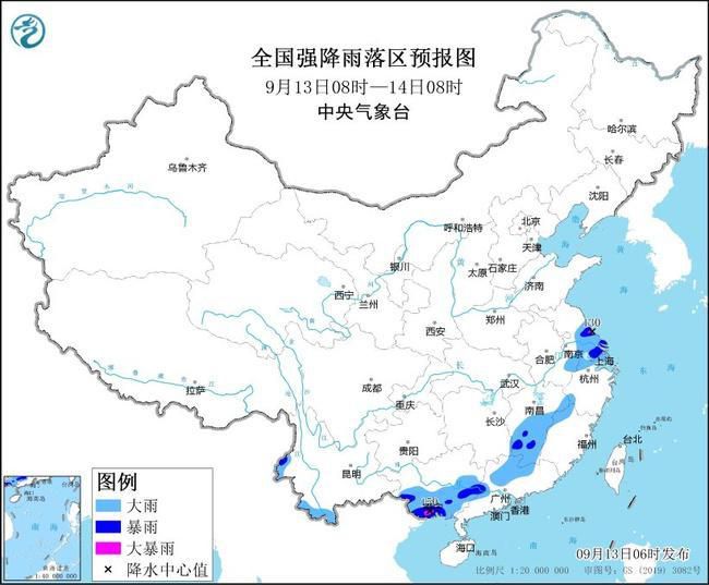 中央气象台9月13日06时继续发布暴雨蓝色预警: