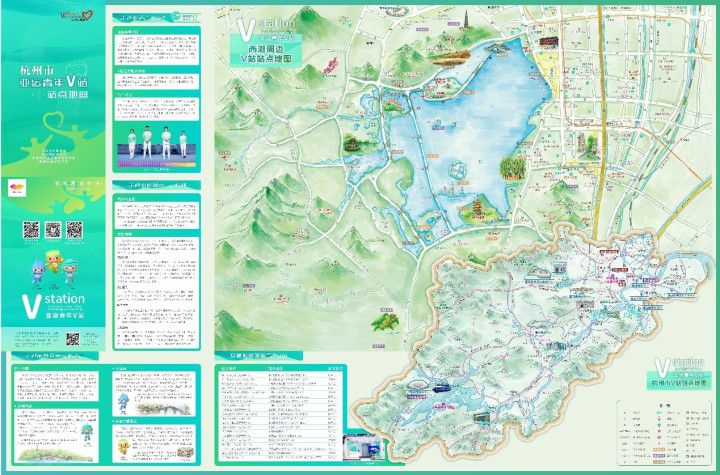 《杭州市亚运青年V站站点地图》以亚运色彩系统中的“湖山绿”为主色调,展现杭州的绿水青山和志愿者的青春活力。地图采用清新、灵动的手绘表达,其正面以嘉宾游客抵杭重要目的地——西湖为主体,展示了西湖周边亚运青年V站站点,并介绍了杭州的世界文化遗产、杭州与亚运、杭州亚运会总赛程等重要信息。