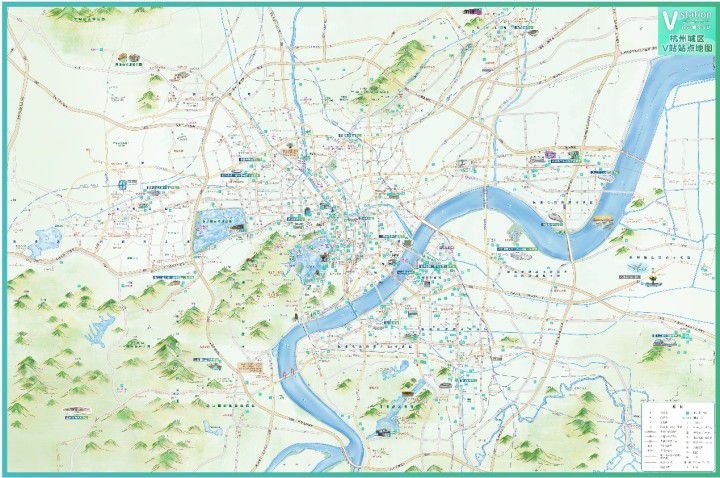 地图背面是一张相对“放大”的杭州城区地图,不仅标注了市区亚运青年V站站点,还将城区交通、自然山水、文旅资源等内容深度融合。