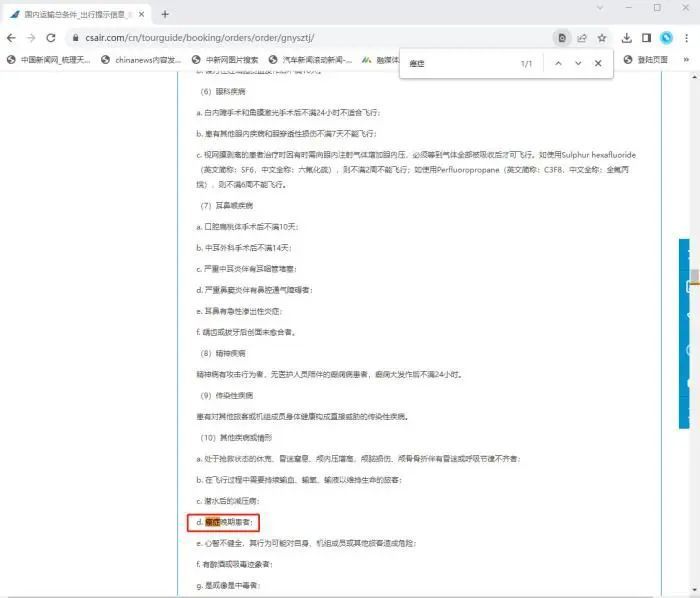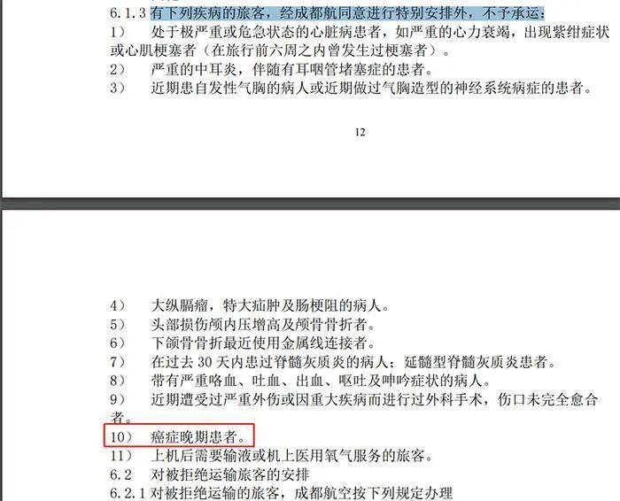 例如,三大航司均明确,拒绝承运怀孕已满36周的孕妇,以及处于发病状态的精神病患者。南航还在“旅客、行李国内运输总条件”中提到“拒绝运输癌症晚期患者”。