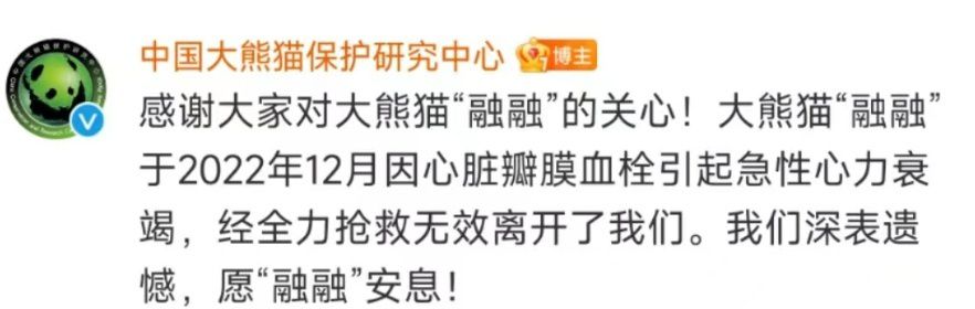 大熊猫“融融”于2022年12月因心脏瓣膜血栓引起急性心力衰竭,经全力抢救无效离开了我们。我们深表遗憾,愿“融融”安息!