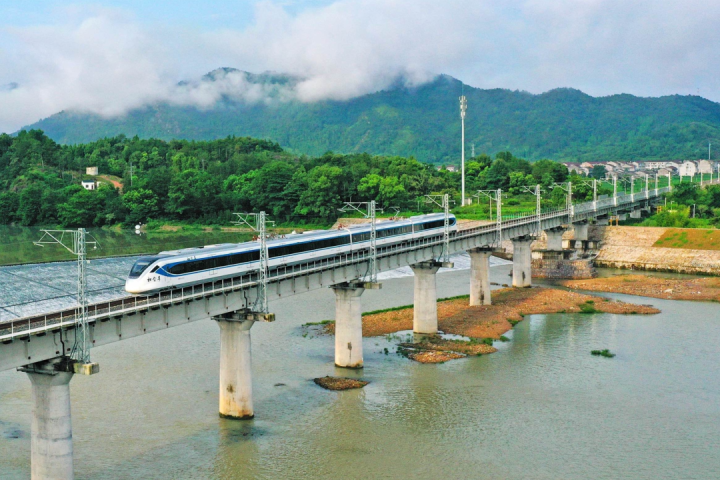 一辆“和合号”市郊列车行驶在金台铁路仙居县境内铁路上。图源:浙江法治报