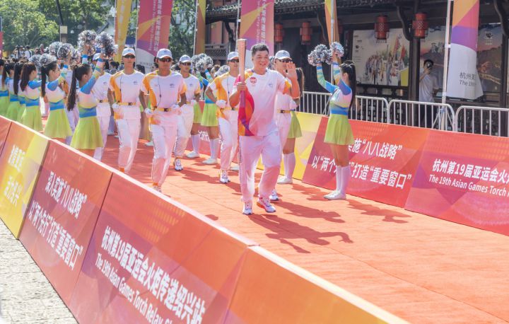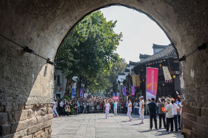 9月19日,杭州亚运会火炬传递衢州站,火炬手经过水亭门。记者 朱海伟 吕之遥 潘海松 摄