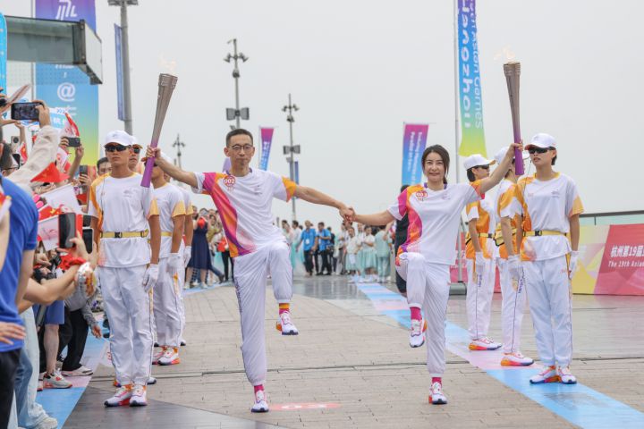 9月20日,杭州亚运会火炬传递活动最后一站在杭州举行。第二棒施一公和第三棒郭晶晶完成传递后,比了一个向前奔跑的姿势。记者 姚颖康 倪雁强 摄