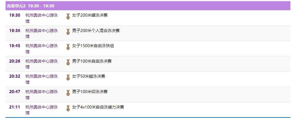 首个决赛是19:30进行的女子200米蝶泳的决赛,“蝶后”张雨霏将冲击这个项目的金牌。