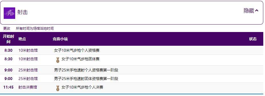 射击比赛也将在24日产生该项目的首枚金牌——女子气步枪团体,比赛开始时间为8:30,但射击首金产生的时间要略晚于赛艇。
