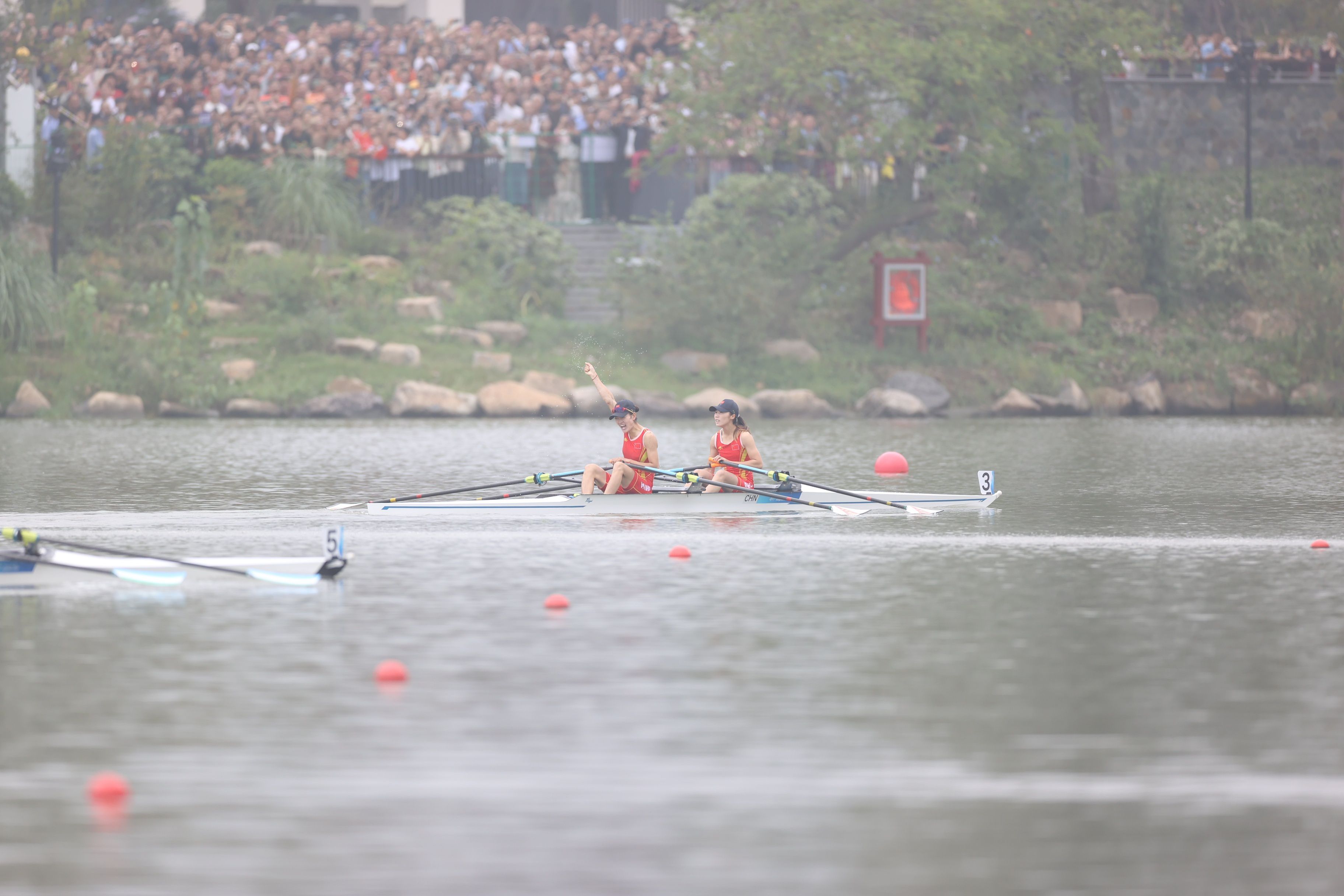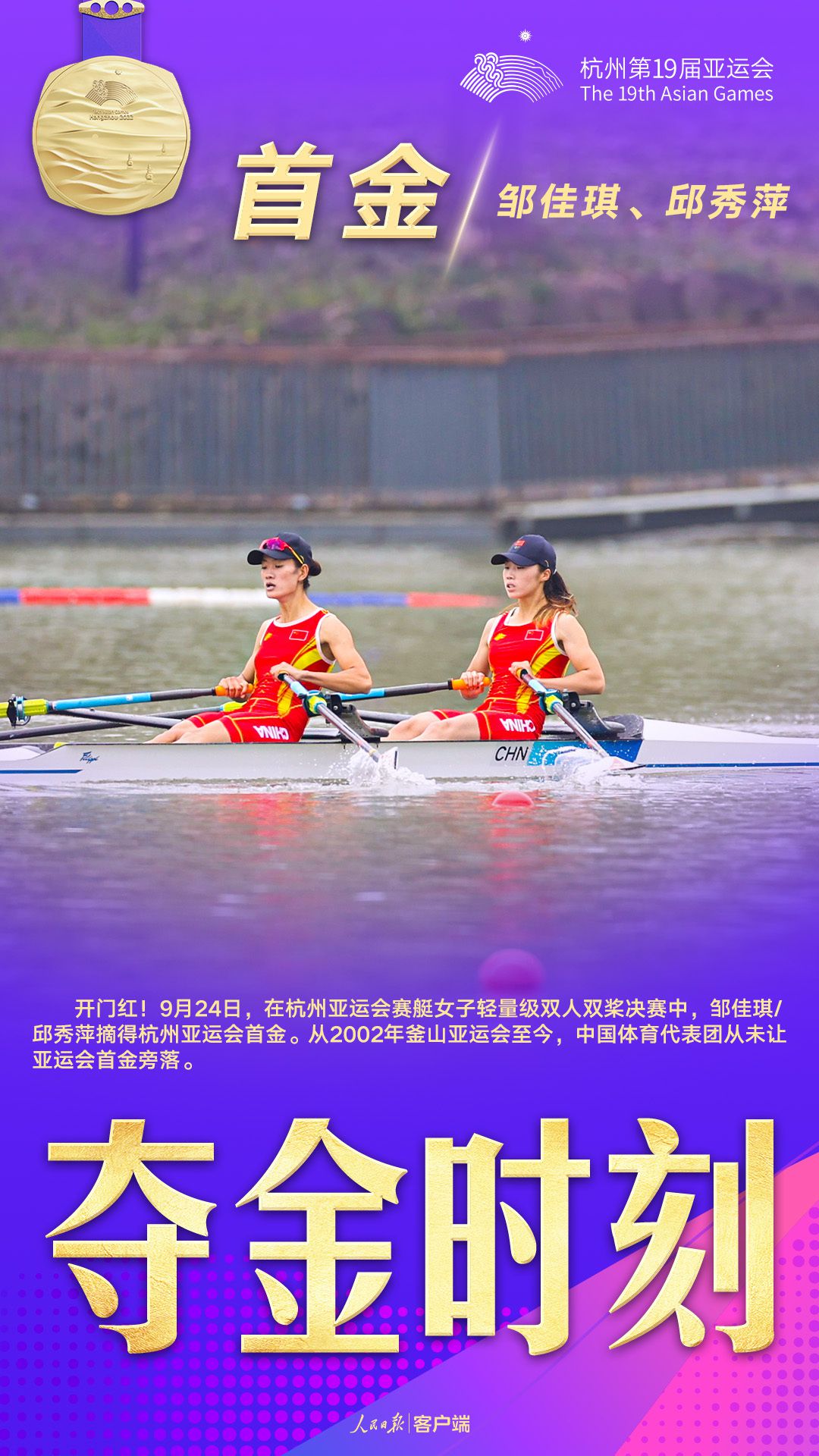 9月24日,杭州亚运会赛艇女子轻量级双人双桨决赛在杭州富阳水上运动中心举行,中国体育代表团的邹佳琪/邱秀萍夺得冠军,摘得杭州亚运会首金,为中国体育代表团赢得开门红!