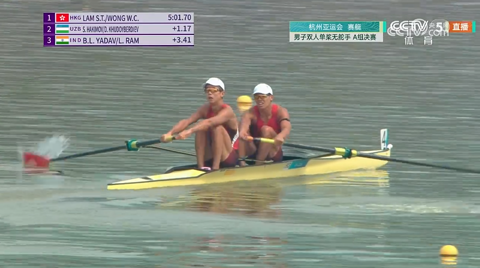 9月24日,杭州第19届亚运会赛艇男子双人单桨无舵手决赛,中国香港组合夺得金牌,这是中国香港代表团在本届比赛获得的首枚奖牌。