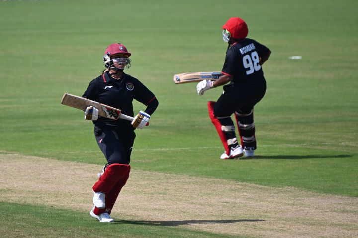 9月19日,印度尼西亚队击球手戴维(左)和翁巴基在浙江省杭州市举行的杭州亚运会板球女子预赛A组比赛中跑动得分。最终,印度尼西亚队战胜蒙古国队。新华社记者 薛宇舸 摄