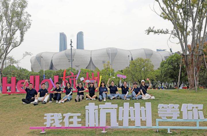 近日,市民们在杭州奥体中心周边的亚运主题景观前打卡,表达喜迎亚运盛会的欢乐心情,向世界传递“杭州欢迎你!”“我在杭州等你!”的盛情邀约。记者 林云龙 摄