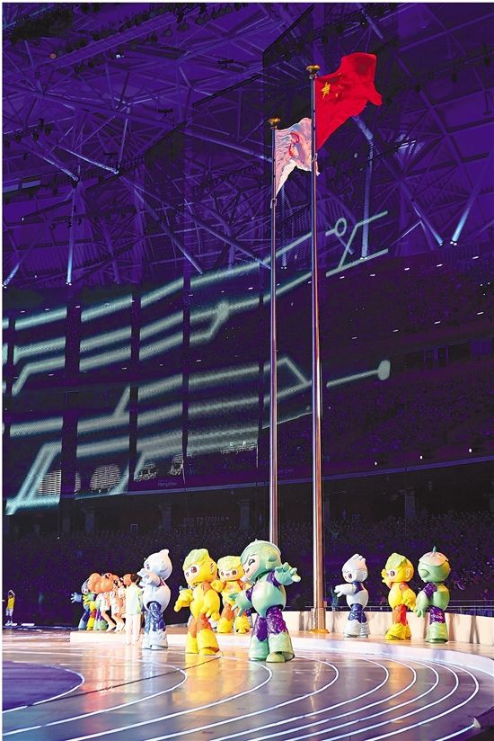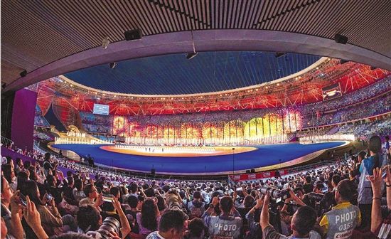 体育场内,天南海北的人们在这里汇集,观众、演员、各代表团运动健儿、“小青荷”……无论何种服装、何种语言、何种肤色,此时此刻,他们都是中国迈向体育强国的见证者,是全民亚运的参与者——