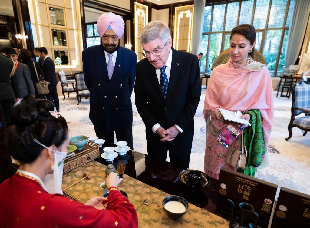 亚奥理事会代理主席辛格和夫人维尼塔、国际奥委会主席巴赫欣赏点茶技艺。新华社记者 黄敬文 摄