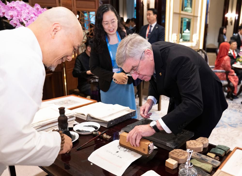 国际奥委会主席巴赫体验木版水印画制作。新华社记者 黄敬文 摄