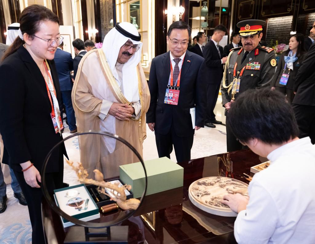 科威特王储米沙勒欣赏东阳木雕。新华社记者 黄敬文 摄