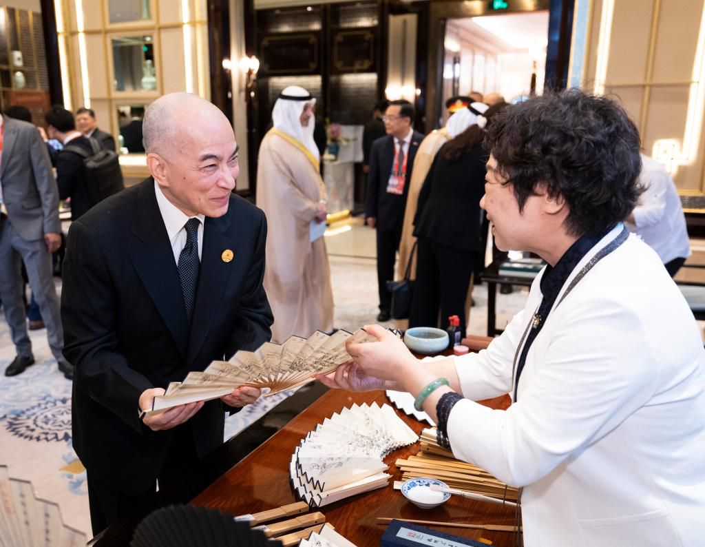 柬埔寨国王西哈莫尼欣赏制扇技艺。新华社记者 黄敬文 摄