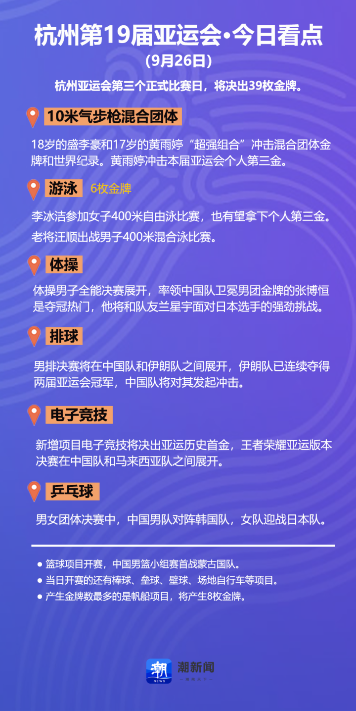 9月26日,杭州第19届亚运会将决出39枚金牌,年轻的男女10米气步枪冠军盛李豪和黄雨婷组队冲击混合团体金牌和世界纪录。若能夺冠,黄雨婷将拿到本届亚运会个人第三金。21岁的李冰洁将参加女子400米自由泳比赛,也有望拿下个人第三金。