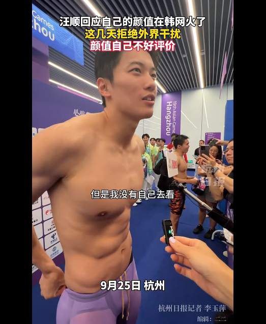 赛后,浙江籍运动员汪顺在接受采访时被提及:热搜上在讨论你的颜值。汪顺则表示:“这几天拒绝外界干扰,别人告诉我才知道。颜值这种东西,自己不好评价。”