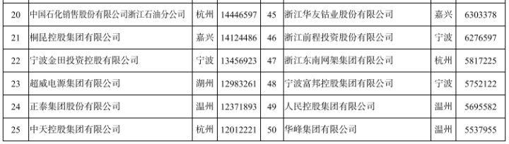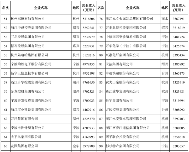 从年营业收入增长看,出现了一批增长超过30%的大型企业,比如绿城房地产集团有限公司、中国石油化工股份有限公司镇海炼化分公司、浙江富冶集团有限公司等。