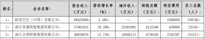 具体来看,阿里巴巴(中国)、浙江荣盛控股集团、浙江吉利控股集团稳居前三。