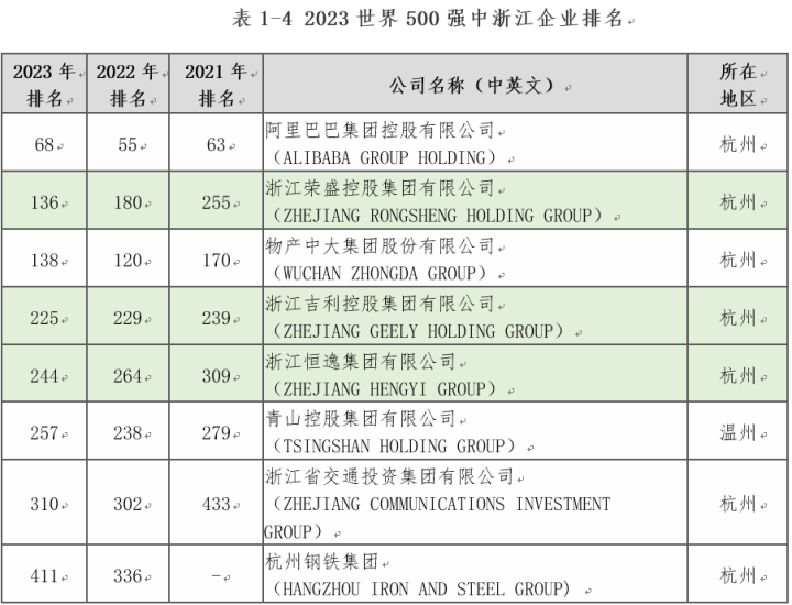 而在2023年《财富》世界500强排行榜中,浙江有8家企业入围,其中浙江荣盛控股集团有限公司、浙江吉利控股集团有限公司、浙江恒逸集团有限公司近三年持续保持位次攀升。