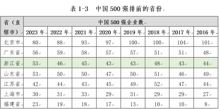 根据此前官方发布的榜单,浙江有53家企业入围2023中国500强企业,在各省(直辖市)排第3位,比上年增加7家企业,是全国各省入围数量增加最多的省份。
