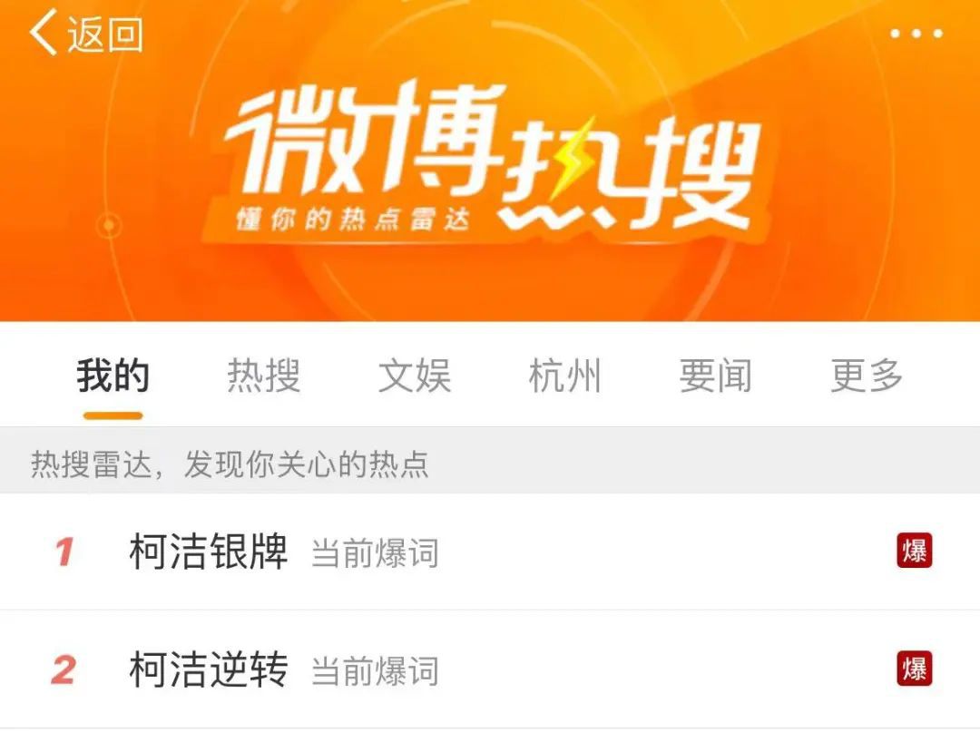 今天,多个柯洁相关话题冲上微博热搜,#柯洁银牌#、#柯洁逆转#、#柯洁 胜率#……