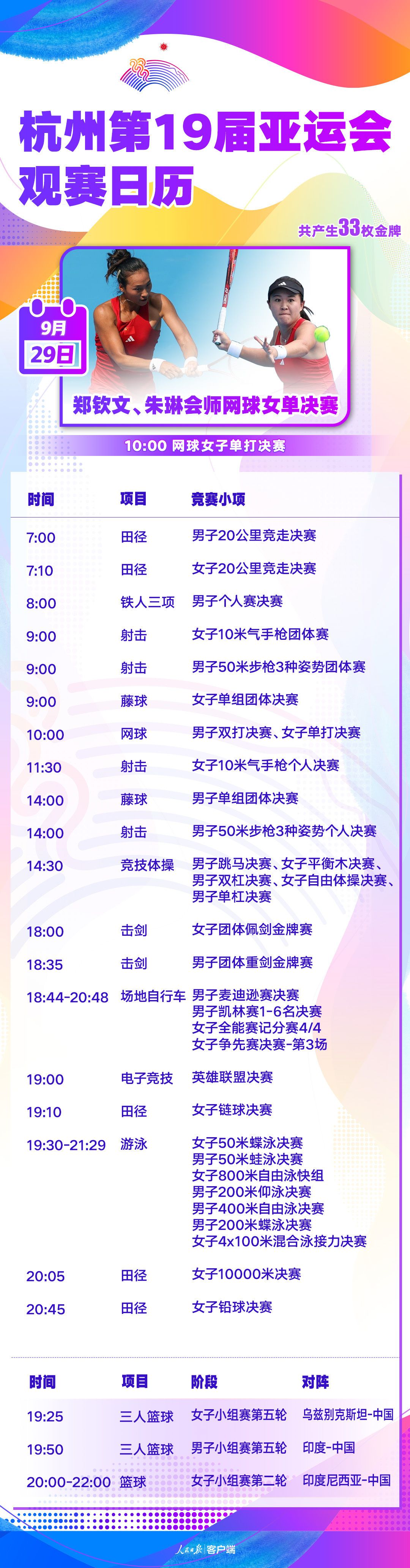 9月29日,杭州第19届亚运会赛场将产生金牌33枚。网球女子单打决赛中国提前锁定金牌,郑钦文与朱琳将上演中国德比。备受关注的游泳“天团”迎来收官之战,张雨霏、覃海洋、徐嘉余等名将再次向金牌发起冲击,游泳项目将决出最后7块金牌。竞技体操赛场也迎来最后一个比赛日,中国体操健儿向4个单项的金牌发起挑战,中国女篮出战第二场小组赛,田径赛场也有中国健儿的夺金身影。今天,这些亚运看点不容错过。