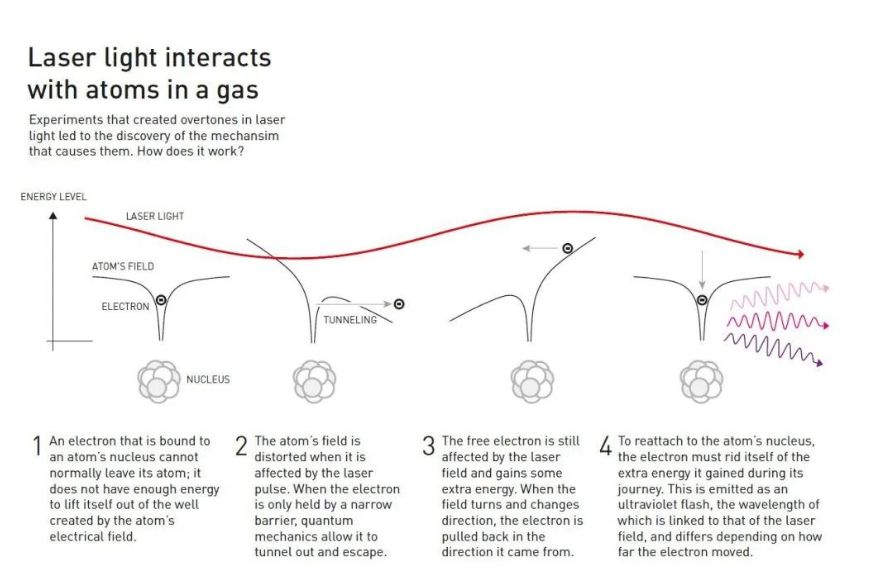 每个“泛音”是激光中每个周期具有给定周期数的光波,它们由激光与气体中的原子相互作用引起,这些相互作用赋予一些电子额外的能量,这些额外的能量然后会以光的形式散射出去,而这些来自电子的光脉冲是“泛音”出现的原因。