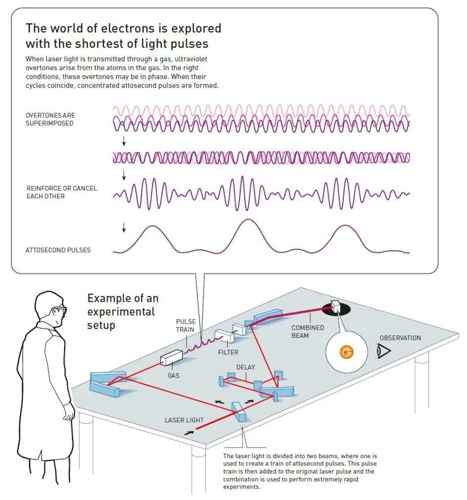 在一个分子中,原子的运动可以用激光产生的最短脉冲来研究;而当电子在原子或分子内部移动时,其速度如此之快,以至于其发生的变化在飞秒(千万亿分之一秒,10的负15次方秒)内变得模糊不清。在电子的世界中,位置和能量在一到几百阿秒内发生变化。