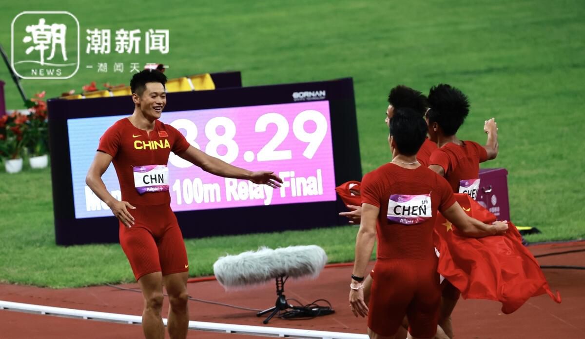 20分钟后,歌曲《年轻的战场》响彻全场,中国男子接力第四棒选手陈佳鹏在终点前绝地反击,中国队以38.29秒的成绩刷新亚运会男子4*100米纪录,夺取金牌。