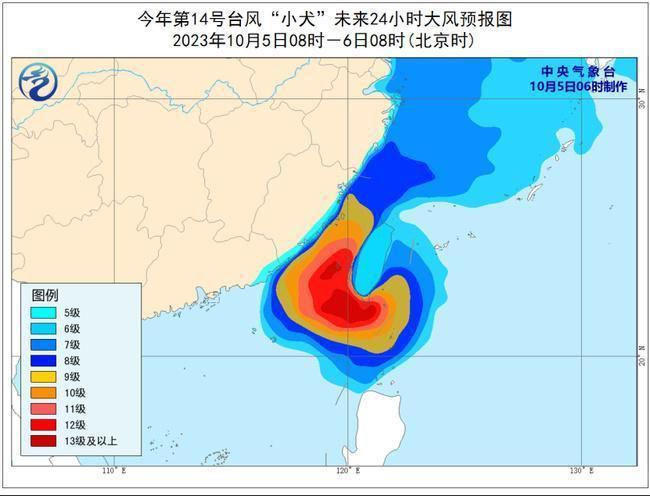 大风预报:5日08时至6日08时,东海大部及钓鱼岛附近海域、台湾以东洋面、台湾海峡、巴士海峡、南海东北部以及杭州湾、浙江沿海、福建沿海、台湾岛沿海将有6-8级、阵风9-10级的大风,其中台湾岛南部海面及沿海、巴士海峡北部海面、台湾海峡风力将有9-12级、阵风13-14级,“小犬”中心经过的附近海面或地区风力可达13-15级、阵风16-17级。