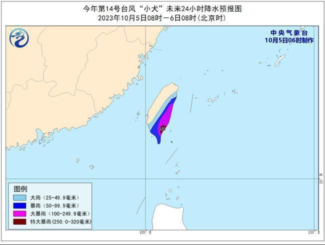 降水预报:5日08时至6日08时,台湾岛中东部有大到暴雨,台湾岛东部部分地区有大暴雨,局地特大暴雨(250-320毫米)。