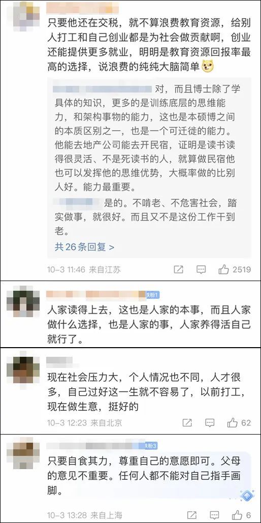 “我不认为我上完博士怎么样了,我不认为我博士的学历必须要用来投入到某个高精尖的事业里,我不觉得我一定要在我发达的老家(上海)待着,我不觉得我辞职有什么大不了……”