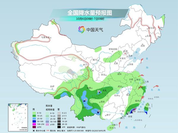 假期临近尾声,我国降水主要出现在西部和华南沿海等地,今明两天(10月5日至6日),华西地区仍有频繁阴雨雪,四川、重庆、湖北、陕西等地需防次生灾害。受台风“小犬”影响,台湾岛今天强降雨持续,明起广东、福建雨势也将明显增强。气温方面,今天冷空气继续影响北方地区,明后两天将影响南方,多地气温将创今年立秋以来新低。