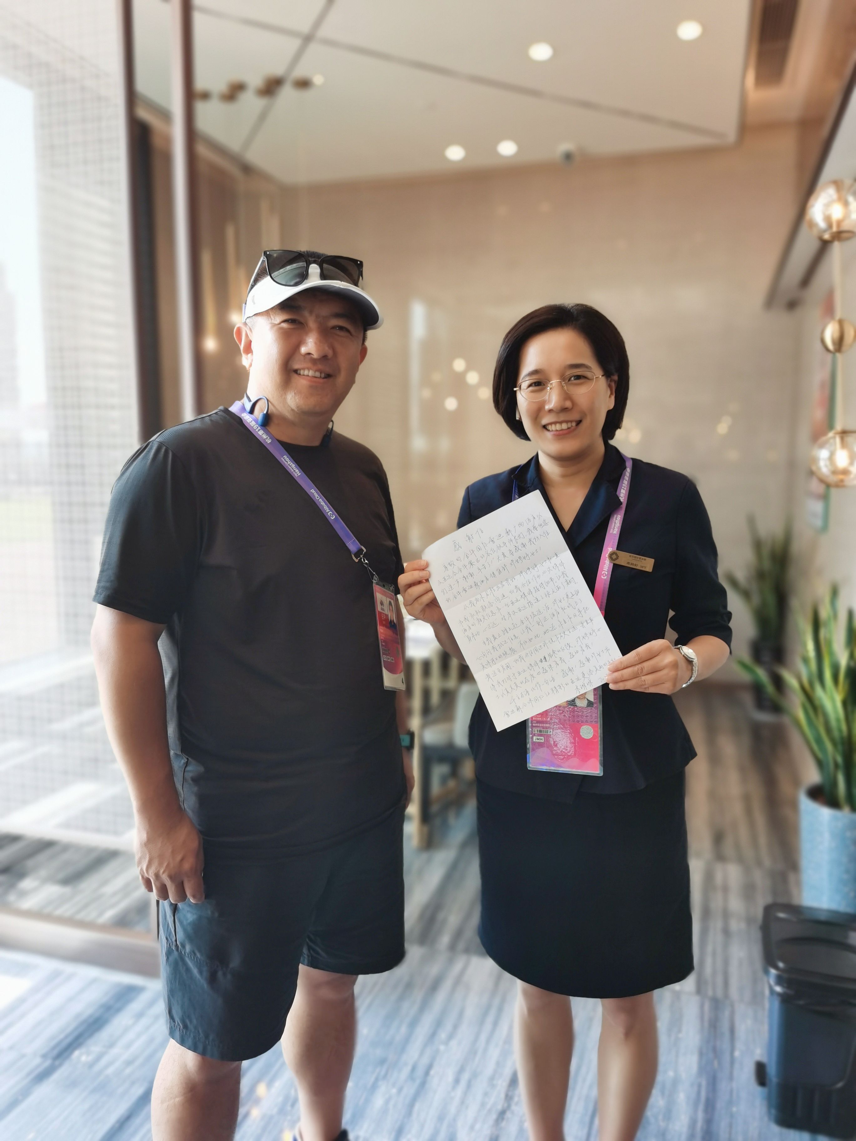 作为官方接待饭店之一,金华国际雷迪森广场酒店接待了来自境内外42名媒体记者,酒店暖心、周到的服务给中外记者们留下深刻印象。亚运官方摄影团队记者李琳琳在满满一页纸的感谢信中,特别点赞酒店营销部副经理邓娉婷。李琳琳说,自己尚未启程出发,邓娉婷就一直与他积极沟通联络、落实抵达接待事宜,而当自己一到达酒店,就吃上了美味可口的晚餐,种种细节让他感动不已。