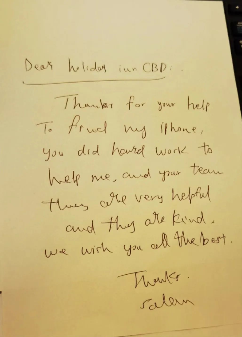 杭州钱江新城假日酒店也收到了来自住店的外籍媒体客人的一封手写感谢信。9月15日晚上,该名客人在乘坐出租车返回酒店的途中,不慎将手机遗落在车上。在抵达酒店后,他急忙反映了这一情况,值班经理黄文霞和前厅部主管石聪聪在得知情况后,第一时间联系出租车公司,通过多方拨打电话沟通,最终联系到了出租车司机,在一个半小时内成功帮客人寻回了手机。客人在激动之余,以一封手写感谢信表达了对假日酒店优质服务的赞赏。