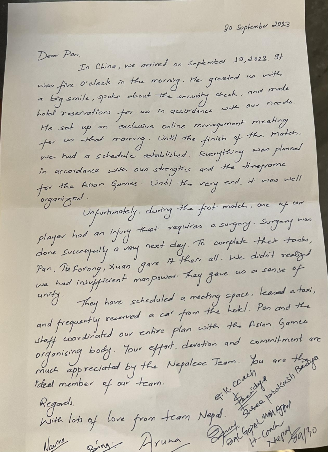 9月30日,尼泊尔女足队结束了在温州12天的行程,临行前,他们向NOC助理团队送上一封手写感谢信,高度赞扬了NOC助理的服务。10月3日,龙舟赛事技术会议举行。会后收到了泰国籍ITO的感谢信,赞扬了“小青荷”周全、细致、热情的服务。