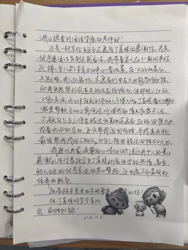 观众孟先生是一家互联网公司的高管,带着家人来看比赛,比赛结束后发现有物品遗留在赛场。焦急的时候,来自浙江越秀外国语学院的志愿者丁晨晓主动上前,提供帮助,帮他们找回了失物。他特意写了一封感谢信给学校。
